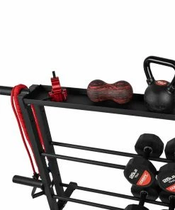 - Maximum Storage: The three layer rack features a top layer for kettlebell and gear storage. The bottom two tiers can hold up to 5 pairs of rubber dumbbells. There are also four side 2” posts to hold and display olympic weight plates. Each post includes a spring loaded collar to keep the weight plates in place. Weight capacity: 1000 lbs.